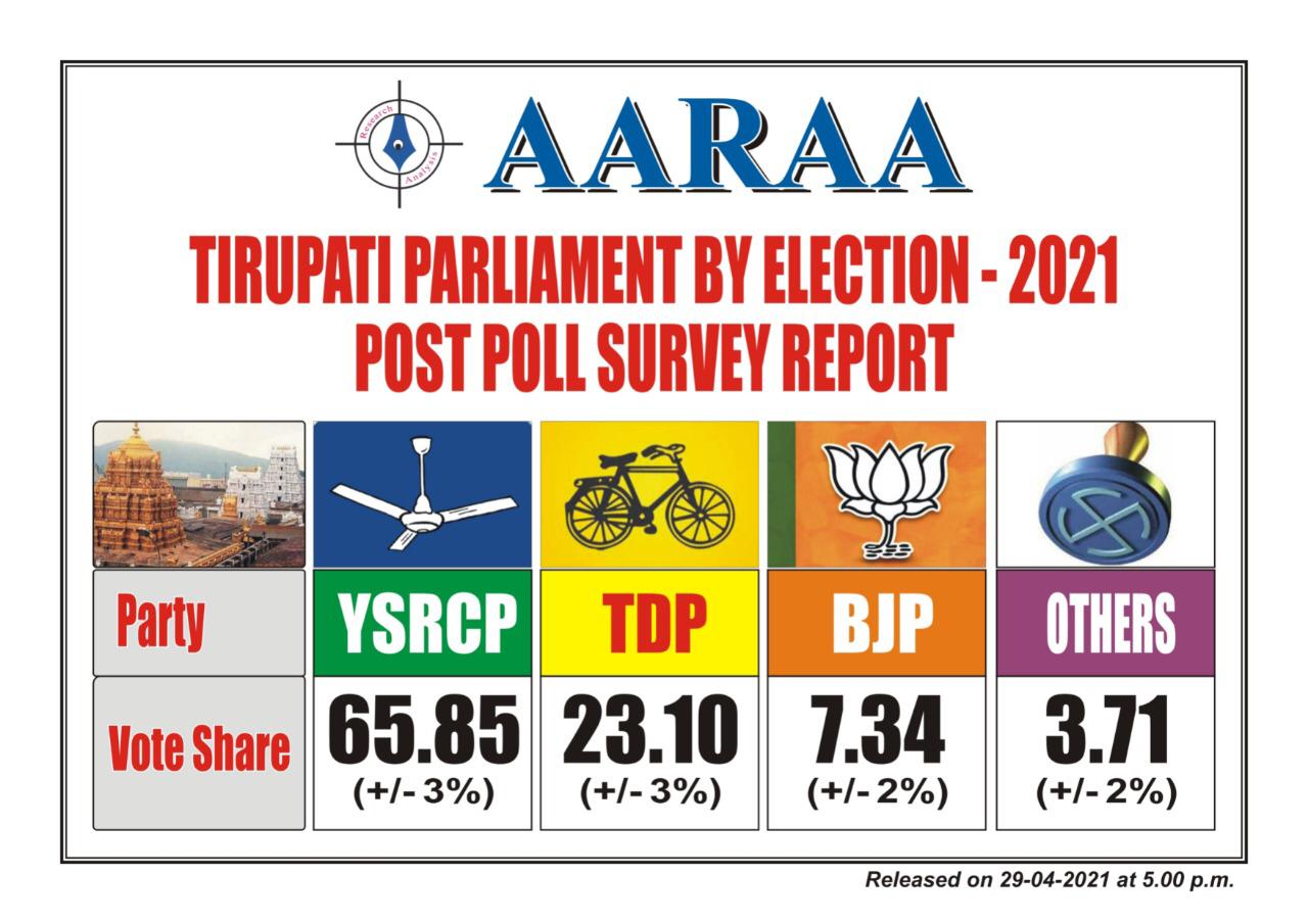 తిరుపతి పార్లమెంట్ ఉప ఎన్నిక. గెలిచేది ఎవరు? నిలిచేది ఎవరు? వైసీపీకి 5 లక్షల మెజార్టీ వస్తుందా? టీడీపీని గెలుపు వరిస్తుందా? బీజేపీ-జనసేనను ఓటర్లు ఆదరిస్తారా? ఇలా, తిరుపతి ఎన్నికల ఫలితాలపై ఎక్కడలేని ఉత్కంఠ. ఎగ్జిట్ పోల్స్ సర్వేలో పేరెన్నిక గల సంస్థ.. "ఆరా".. తిరుపతి పోస్ట్ పోల్ సర్వే రిపోర్ట్ రిలీజ్ చేసింది. అందులో ఆసక్తికర రిజల్ట్స్.. గెలుపు, ఓట్ల శాతం ఎవరూ ఊహించని విధంగా వచ్చింది. అందుకే, ఆరా పోస్ట్ పోల్ సర్వేపై పెద్ద ఎత్తున చర్చ జరుగుతోంది.
