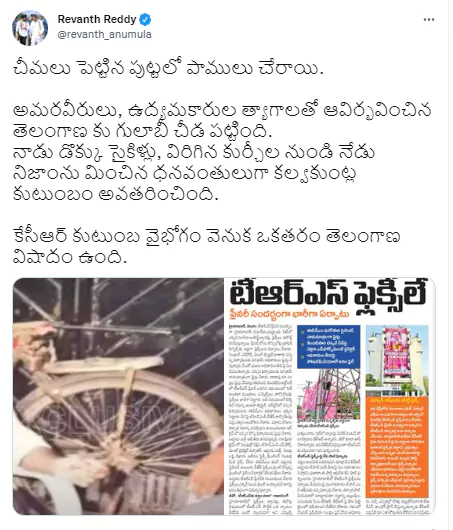 టీపీసీసీ చీఫ్ రేవంత్ రెడ్డి టీఆర్ఎస్పై ట్విట్టర్ వేదికగా తీవ్ర విమర్శలు చేశారు. ‘‘చీమలు పెట్టిన పుట్టలో పాములు చేరాయని, అమరవీరులు, ఉద్యమకారుల త్యాగాలతో ఆవిర్భవించిన తెలంగాణకు గులాబీ చీడ పట్టింది.. నాడు డొక్కు సైకిళ్లు, విరిగిన కుర్చీల నుంచి నేడు నిజాంను మించిన ధనవంతులుగా కల్వకుంట్ల కుటుంబం అవతరించింది.. కేసీఆర్ కుటుంబ వైభోగం వెనుక ఒకతరం తెలంగాణ విషాదం ఉంది.’’అంటూ ట్వీట్ చేశారు.