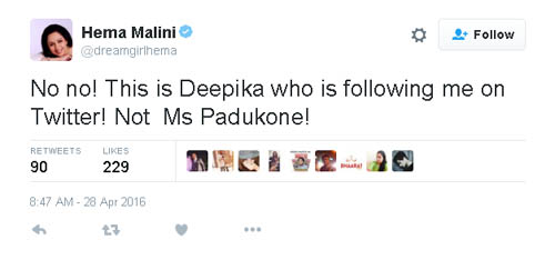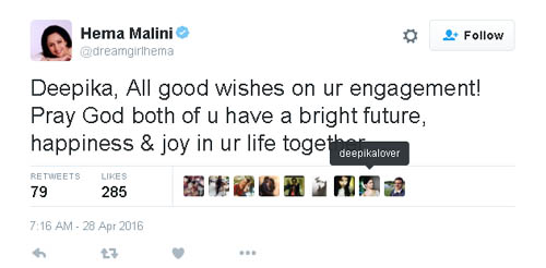 ఇది చూసిన బాలీవుడ్ జనాలందరూ, దీపికా పదుకుణేకు లవర్ రణ్ వీర్ సింగ్ తో ఎంగేజ్ మెంట్ అయిపోయింది అని చెవులు కొరుక్కోవడం మొదలెట్టేశారు. ఇది ఎంతలా స్ప్రెడ్ అయిందంటే, వెంటనే హేమ మళ్లీ " నేను విషెస్ చెప్పిన దీపిక నటి పదుకుణే కాదు. నా ట్విట్టర్ ఫాలోవర్ " అంటూ క్లారిటీతో ట్వీట్ చేయాల్సి వచ్చింది. ముందే ఆ దీపికను సర్ నేమ్ తో ట్వీట్ చేసి ఉంటే హేమమాలిని కు ఈ ఇబ్బంది ఉండకపోయేది. అందుకే అంటారు సోషల్ మీడియాను రెండు వైపులా పదునున్న కత్తి అని.