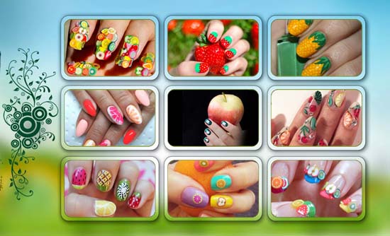 ఈ రకమైన నెయిల్ ఆర్ట్ లో రకరకాలుగా డిజైన్స్ వేస్తున్నారు బ్యూటీషియన్లు. గోళ్లపై పండ్ల ఆకారాలను అద్దడం ఒక రకమైతే... పండ్ల ముక్కల్ని గోళ్లమీద అతికించారా అన్నట్టుగా వేసే డిజైన్లు మరో రకం. మరో రకం కూడా ఉంది. పండ్ల ఆకారంలో గోటిని వదిలేసి మిగతా భాగమంతా పెయింట్ చేస్తుంటారు. అదనపు ఆకర్షణ కోసం స్టోన్స్, కుందన్స్ అతకడం కూడా జరుగుతోంది. చక్కని రంగులు, అద్భుతమైన డిజైన్లతో నఖ సౌందర్యం రెట్టింపవుతోంది. సిటీస్ లో అయితే ఆల్రెడీ పెయింట్ చేసిన ఆర్టిఫీషియల్ నెయిల్స్ కూడా దొరుకుతున్నాయి. వీటిని కొనుక్కుని జస్ట్ అలా గోళ్లకు అతికించేసుకోవడమే. స్కిక్కర్స్ రూపంలో కూడా దొరుకుతున్నాయి.