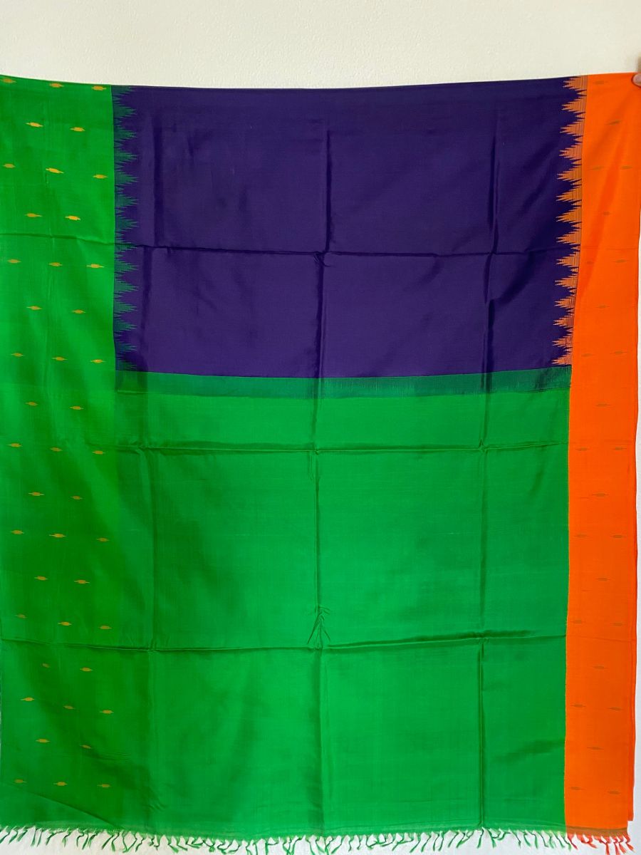 Usually, Gadwal sarees are woven as fine cotton sarees with either mulberry or tussar silk pallu and border. On rare occasions, pure-silk sarees are woven too. The speciality of the Gadwal sarees is their bright and contrasting colours, Kotakomma (Temple) technique, and the kuttu or Kuppadam or Tippadam (the interlocked weft) technique.