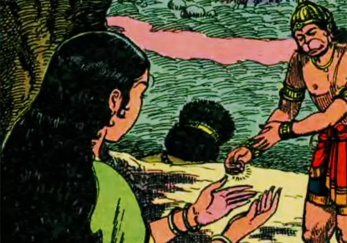అమ్మా! నేను వానరుడిని, రాముడి పలుకున వచ్చిన రామదూతని రామనామాంకితమైన ఉంగరాన్ని నీకు తీసుకొచ్చాను. నీకు నమ్మకం కలగడం కోసమని రాముడు దీనిని నాకిచ్చి పంపించాడు. ఈ ఉంగరాన్ని తీసుకున్నాక ఇవ్వాల్టితో నీ కష్టాలన్నీ పోయాయి, ఇక నువ్వు ఉపశాంతిని పొందుతావు" అన్నాడు.