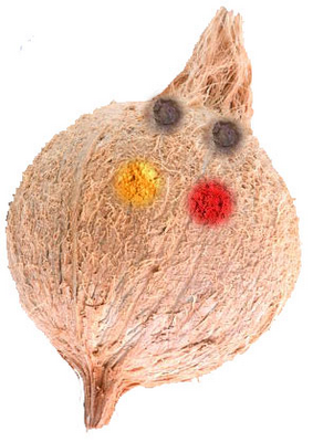 కొబ్బరికాయ మూడు భాగాలుగా కనిపిస్తూ ఉండగా ఒక భాగం పెద్దగా ఉంటుంది. దానికి ఎదురుగా రెండు సమ భాగాలు ఉంటాయి. ఆ రెండు బాగాల్లో