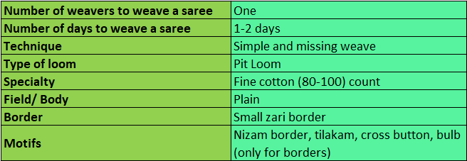 (This is a nizam border saree. Here, the weaver used cotton threads instead of zari.)