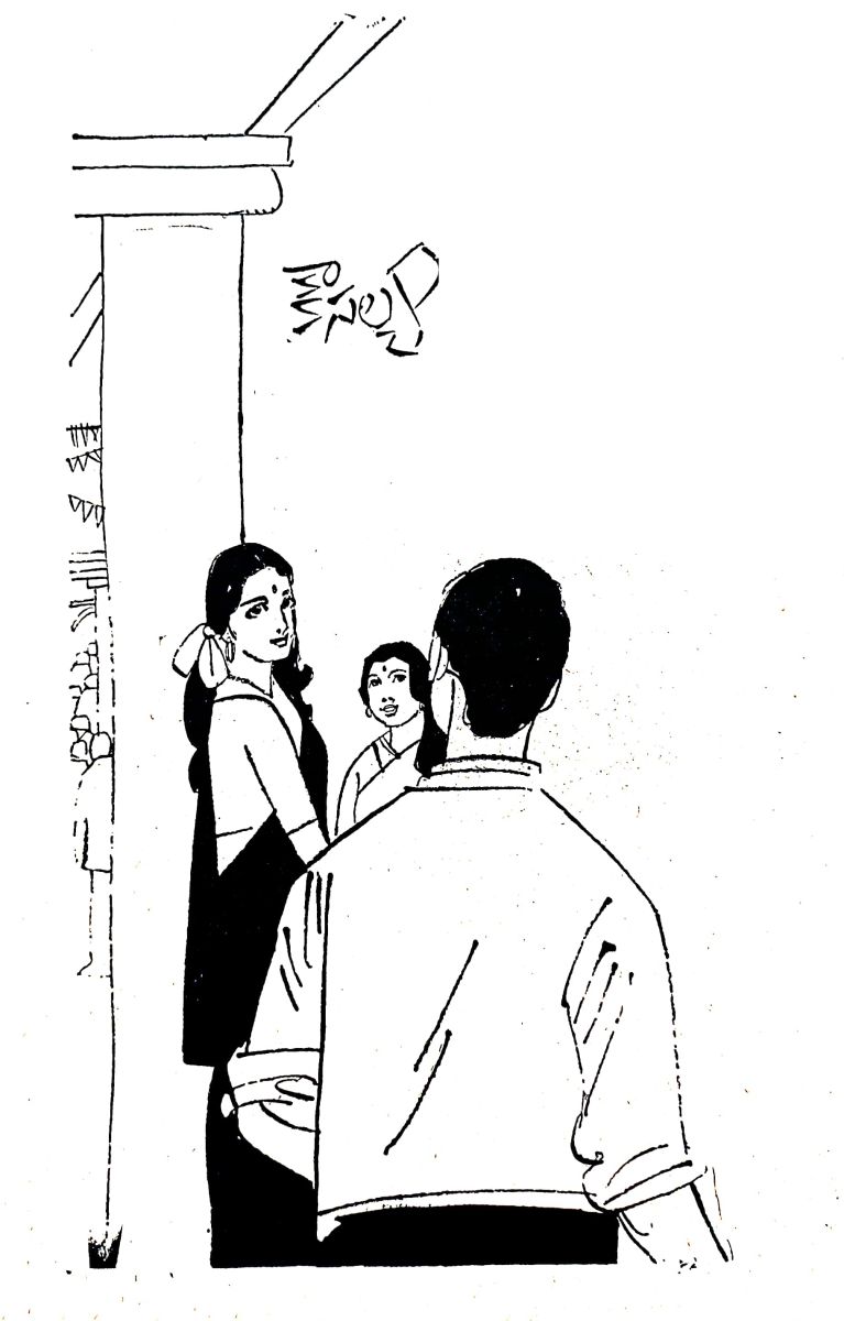 "జానకీ!" అని వరండా చివర నుంచి వినిపించిన కేకకు, తన గదిలోకి వెళ్ళబోతున్న జానకి గుమ్మం లోనే ఆగి వెనక్కు తిరిగి చూసింది. పద్దెనిమిది పందొమ్మిదేళ్ళ అందమైన అమ్మాయి ఎవరో నవ్వుతూ గబగబా తనకేసి వస్తున్నది. దగ్గరగా వచ్చి, "ఏమిటి, అలా తెల్లబోయి చూస్తావు? నేనెవరో జ్ఞాపకం లేదా?' అంది ఆ అమ్మాయి. మొదట్లో కొంచెం తొట్రుపాటు పడింది జానకి. పరిశీలనగా చూసి "ఓ! నువ్వా, జ్యోతీ!" అంది.