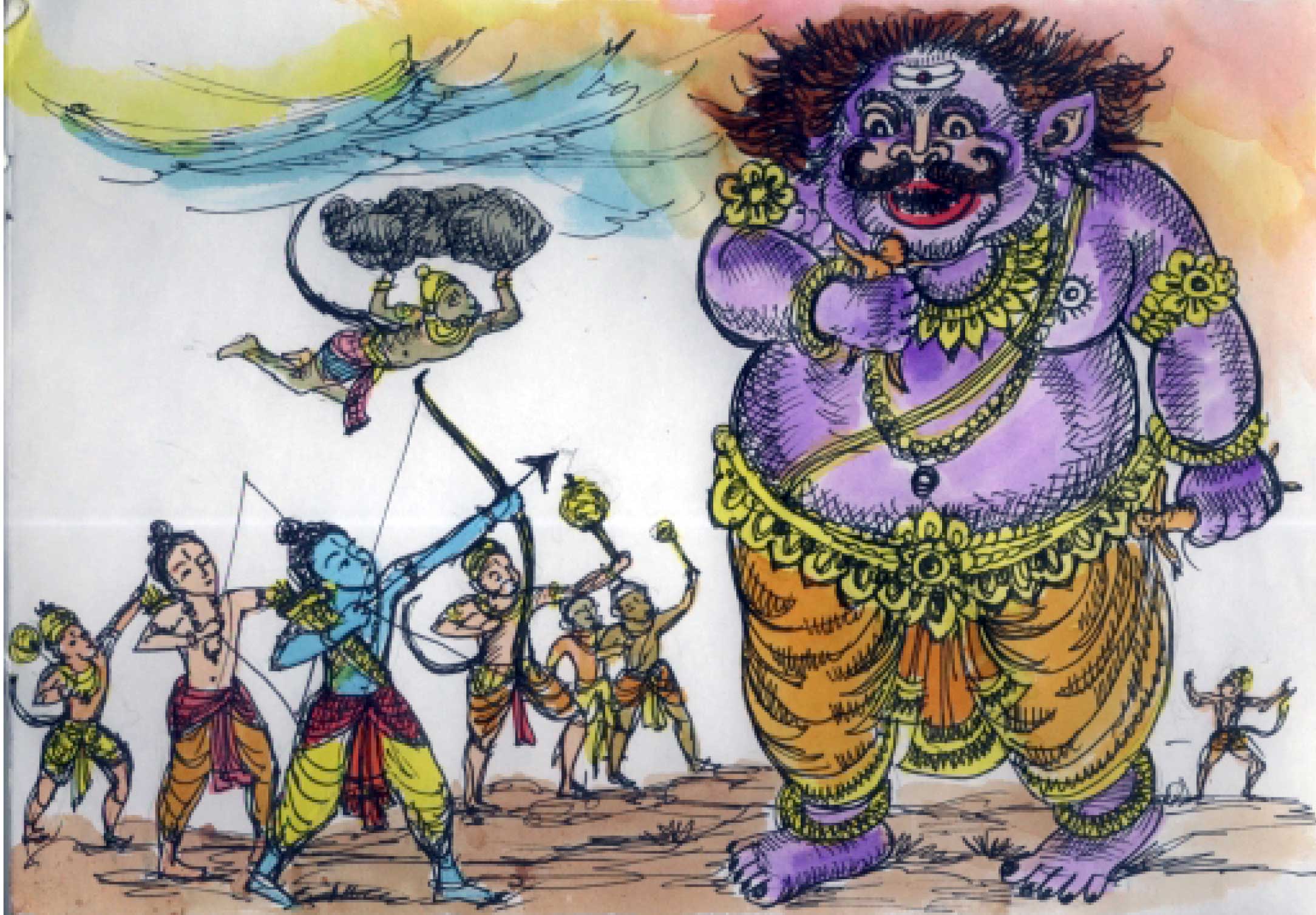కుంభకర్ణుడు: నా గాయముల నుండి రక్తము జలపాతముల వలె పడుచున్నది. యాతనను భరించలేకపోవుచున్నాను.