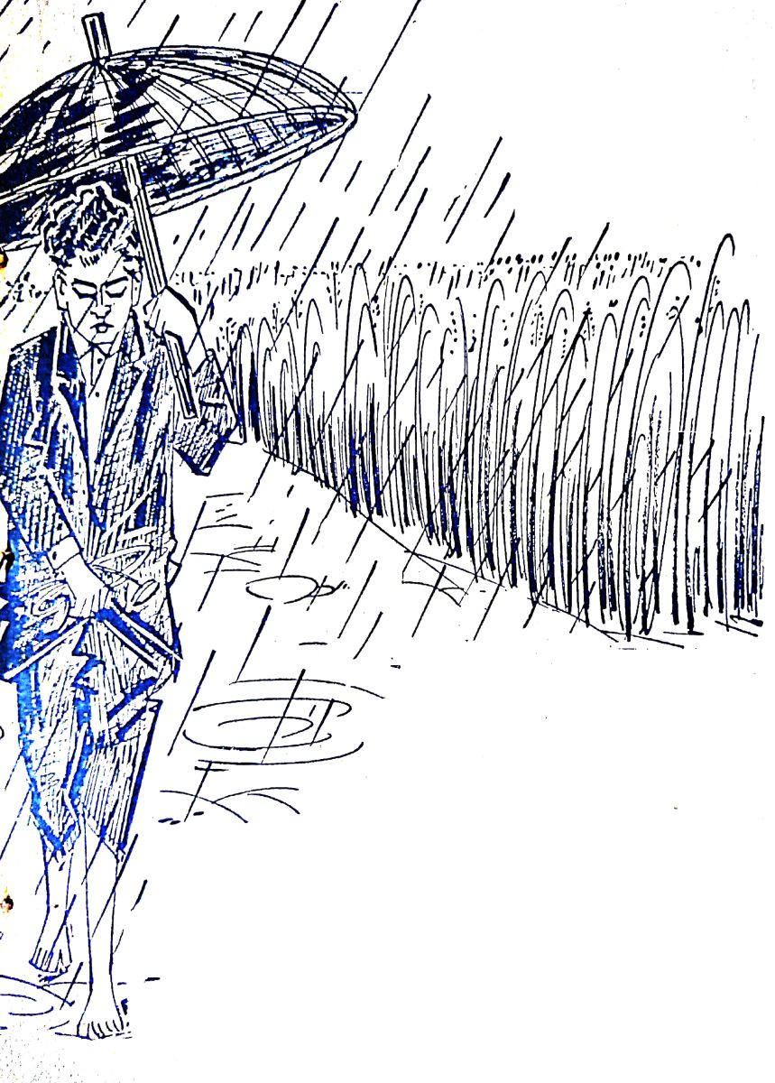ఇలా ఎవరి ఆలోచనల్లో వాళ్ళు ఉండి శంకరం , వెంకడు ఒకళ్ళ నొకళ్ళు పలుకరించుకోకుండా మౌనంగా ముందుకు వెనకలు గా నడుస్తున్నారు. అలవాటు లేకనో, ఆలోచన తెగకనో శంకరం అడుగు బురదలో మందంగా పడుతోంది. అవతల ఎలా వుంటుందో అని ఆందోళన వల్ల వెంకడు చురుగ్గా అడుగేస్తున్నాడు. ఇంకా సన్నగా పడుతూన్న తుంపర. అప్పుడే పైకి వస్తూ మేఘాల పరదాలు తప్పించు కుంటూన్న సూర్య కిరణాల వెలుగు పడి ఆకాశం నుంచి పడుతూన్న బంగారు నాణాల గుంపులా వుంది. గాలికి ఊగి ఆకుల్లో వున్న నీళ్ళ చినుకులు మీద పడుతూ ఉంటె . వానకి జడిసి చెట్ల గుబురుల్లో కూచుని రెక్క కింద ముక్కు మూసుకుని జపం చేస్తూన్న పక్షులు చిరాకు పడి చిర్రుబస్సు మంటున్నాయి.