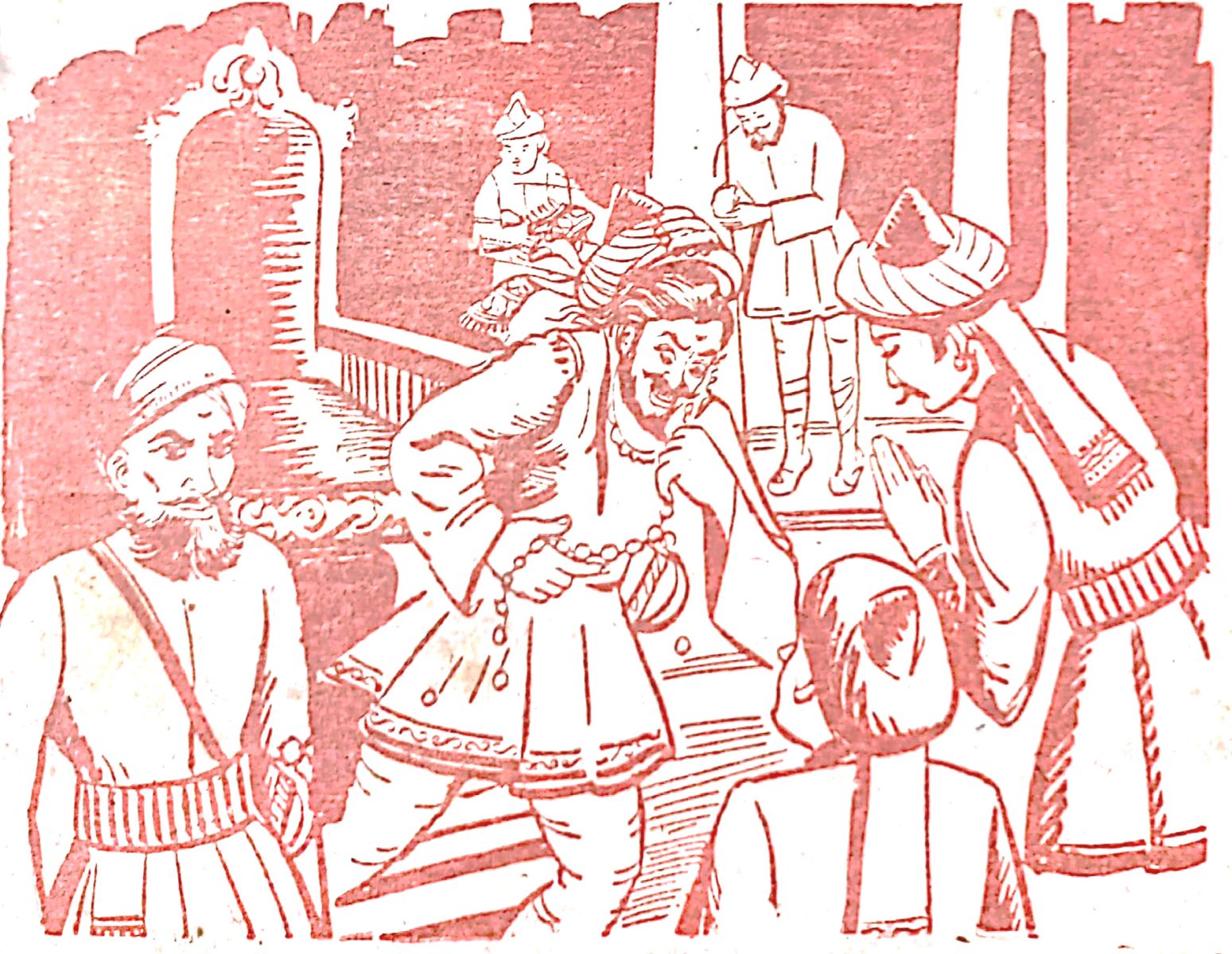 "వూ! మాట్లాడరేం?' అని గర్జించాడు రఘో బా. వాళ్ళిద్దరూ అక్కడ కూర్చున్న వారిని కలియ చూశారు.