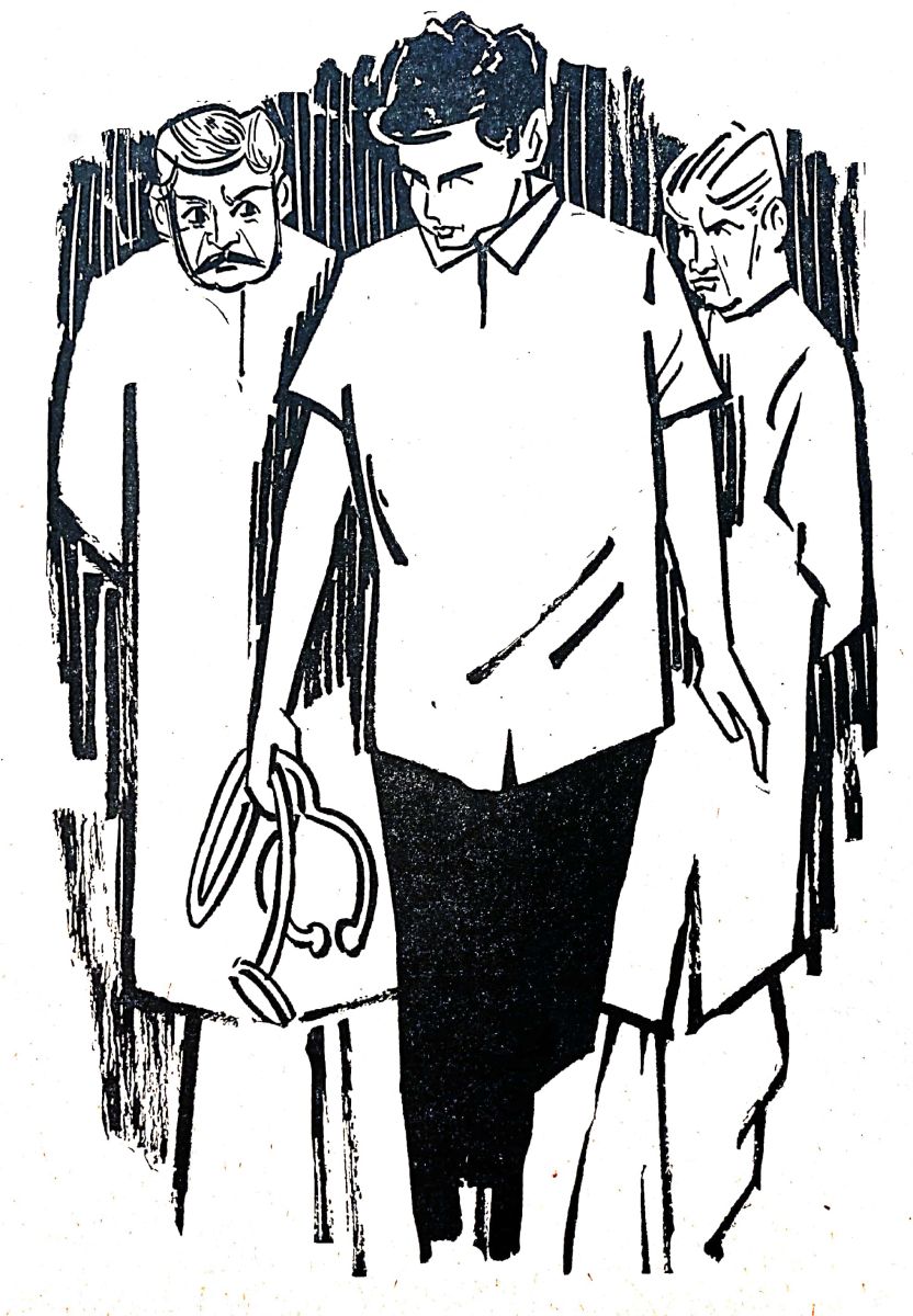 ఇదంతా దేనికి నాంది? కుమారీ పసివాడు కాడు. వారి మాటల్లోని అంతరార్ధం గ్రహించటానికి-ఎంత సేపో పట్టలేదు. హృదయం అనిర్వచనీయమైన బాధతో బరువెక్కింది. కాని వెంటనే స్థాయి పడి అన్నాడు; "నాకు చాలా పనుంది. ఇప్పుడు మీరు చెప్పినదంతా నాకనవసరం లేదు. అవన్నీ మీరు పోలీసు వారికి తెల్పండి. నా రిపోర్టు కవన్నీ అక్కర్లేదు....శవానికి సంబంధించిన మేరకు..."