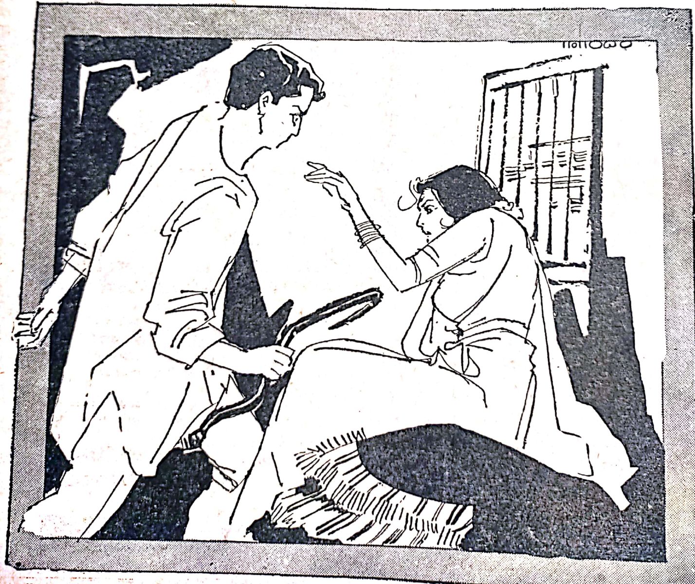 'లోపల ఏం సంతోషిస్తుందో ఆ భగవంతుడి కెరుగ గాని.... ఎక్కడికి వెంటబెట్టుకొని వెళ్ళినా పాపం ఆ అమ్మాయి ప్రాణాలు గుప్పెట్లో పెట్టుకుని వెడుతుంది. మొన్న ఓసారి మా మేనేజరు తో నేను సినిమాకు వెళ్ళినప్పుడు ఈవిడా ఈమె భర్తా ముందు వరుసలో కూచున్నారు. మొదట్నుంచీ చివరి దాకా ఆ పిల్లని సాధిస్తూనే ఉన్నాడు. ఒక అయిదు నిమిషాల పాటైనా సరిగా సినిమా చూడనిచ్చింది లేదు. ఎవరి వేపో చూస్తున్నదనీ, పక్కసీటు చేతి మీద మొగాడి చెయ్యి కావాలని తగిలించిందనీ, పమిట సరిగా కప్పుకోలేదని ఒకటేమిటి , సినిమా ధోరణి సినిమాది . అతని ధోరణి అతనిది - ఆ అమ్మాయి పాపం ఒక్క మాటకు జవాబు చెప్పింది లేదు. ఆమె భయమల్లా ఒక్కటే, వాళ్ళ మాటలు విని తక్కిన నలుగురూ ఏమనుకుంటున్నారో అని.'