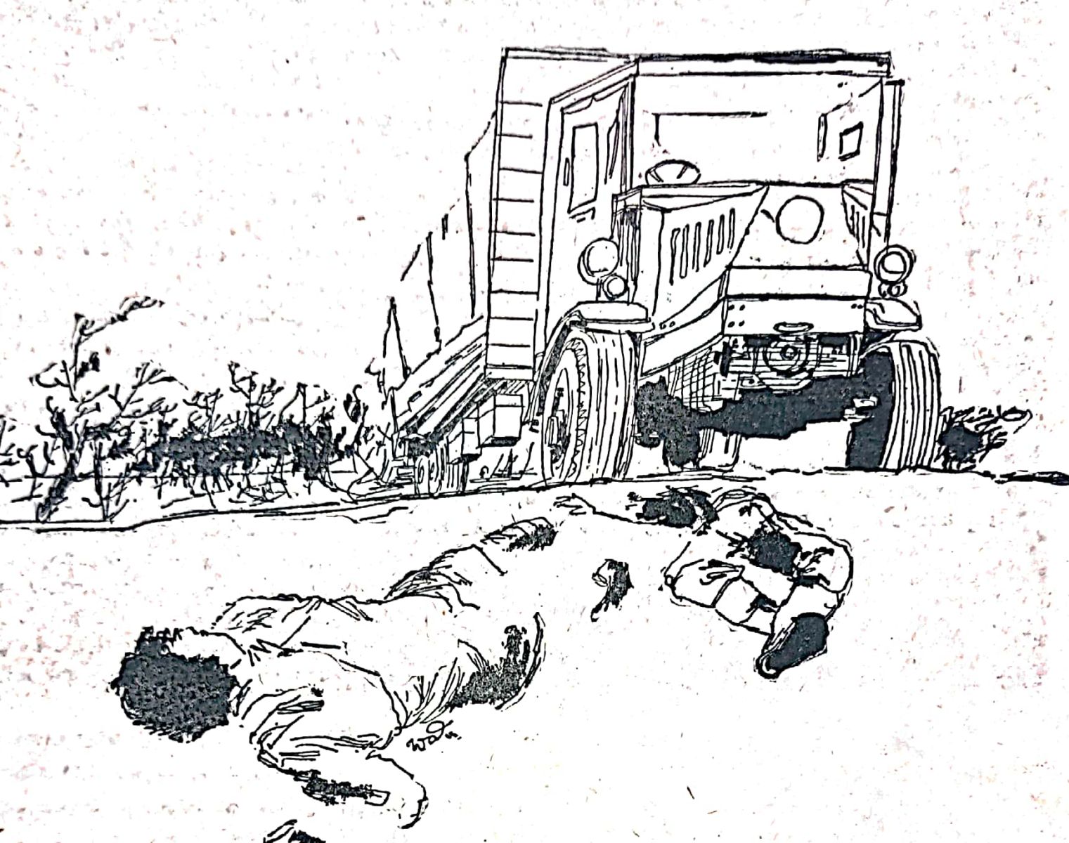 లారీ కదిలిపోయింది. కొంతవరకు రస్తామీద, ఆ తరువాత చౌరస్తా మీద, అమర్ సింగ్ లారీని అడవి దారి పట్టించి, అక్కడ దూరంగా ఒక ఏటిగట్టున వున్న రెబడు పూరియిళ్ళ దగ్గిర ఆపాడు, సరుకులు వాటిలో పెట్టి తాళం వేశాడు లారీ ఓ పెద్ద పూరిపాక లోకి వెళ్ళిపోయింది. పాకమీద ఆకులూ తీగలూ దట్టంగా వున్నాయి. అందులో వుంటే లారీ బ్రహ్మదేవుడికి కనిపించదు.