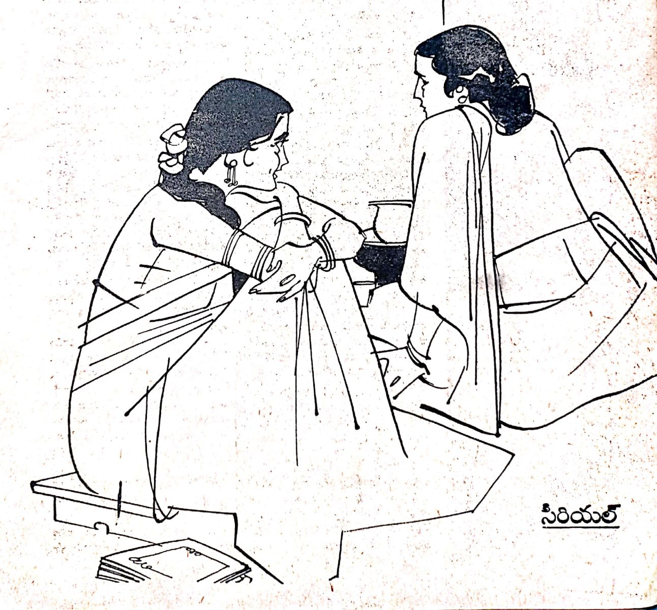 గోడవారగా వేసి ఉన్న పీట చూపిస్తూ - "కూర్చో , కాఫీ త్రాగి వేల్దువు గాని" అంది మీనాక్షి కుంపటి మీద కాఫీకి నీళ్ళు పెట్టుతూ.