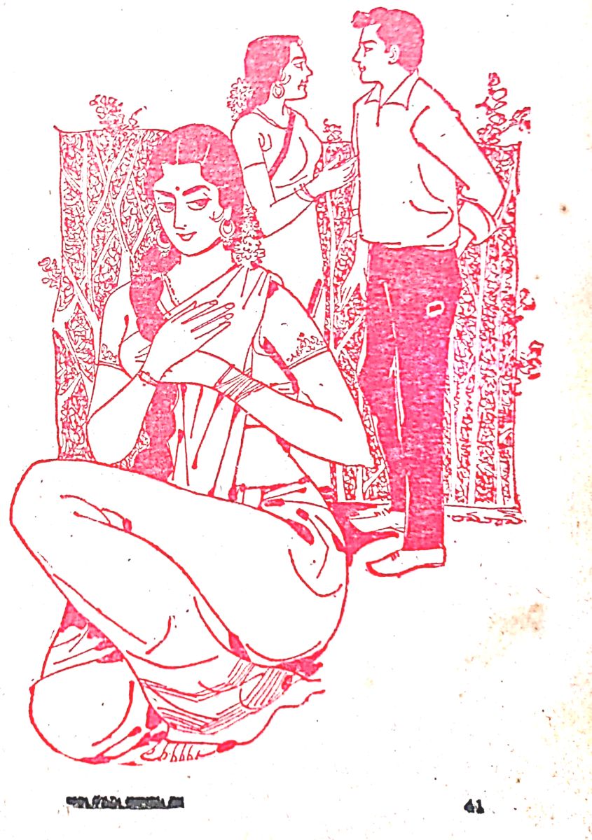 శ్యామలా సుళువుగా దాటేస్తే, కాళ్ల కి పరికిణా బంధాలు పడ్డందున రాధ ఆ నీళ్ళ లో పడిపోయింది. 'అయ్యో ఇదేమిటే?' అంటూ శ్యామల వెంటనే చెయ్యిచ్చి ఇవతలకి రప్పించింది గాని అసలే వుల్లి పోరలాంటి చీరేమో! అందుకు తోడు తడవడం తో బట్ట వంటి కంటుకు పోయినందున రెండు చేతులూ మోకాళ్ళ కి చుట్టేసుకుని అక్కడే కూర్చుండి పోయింది రాధ.