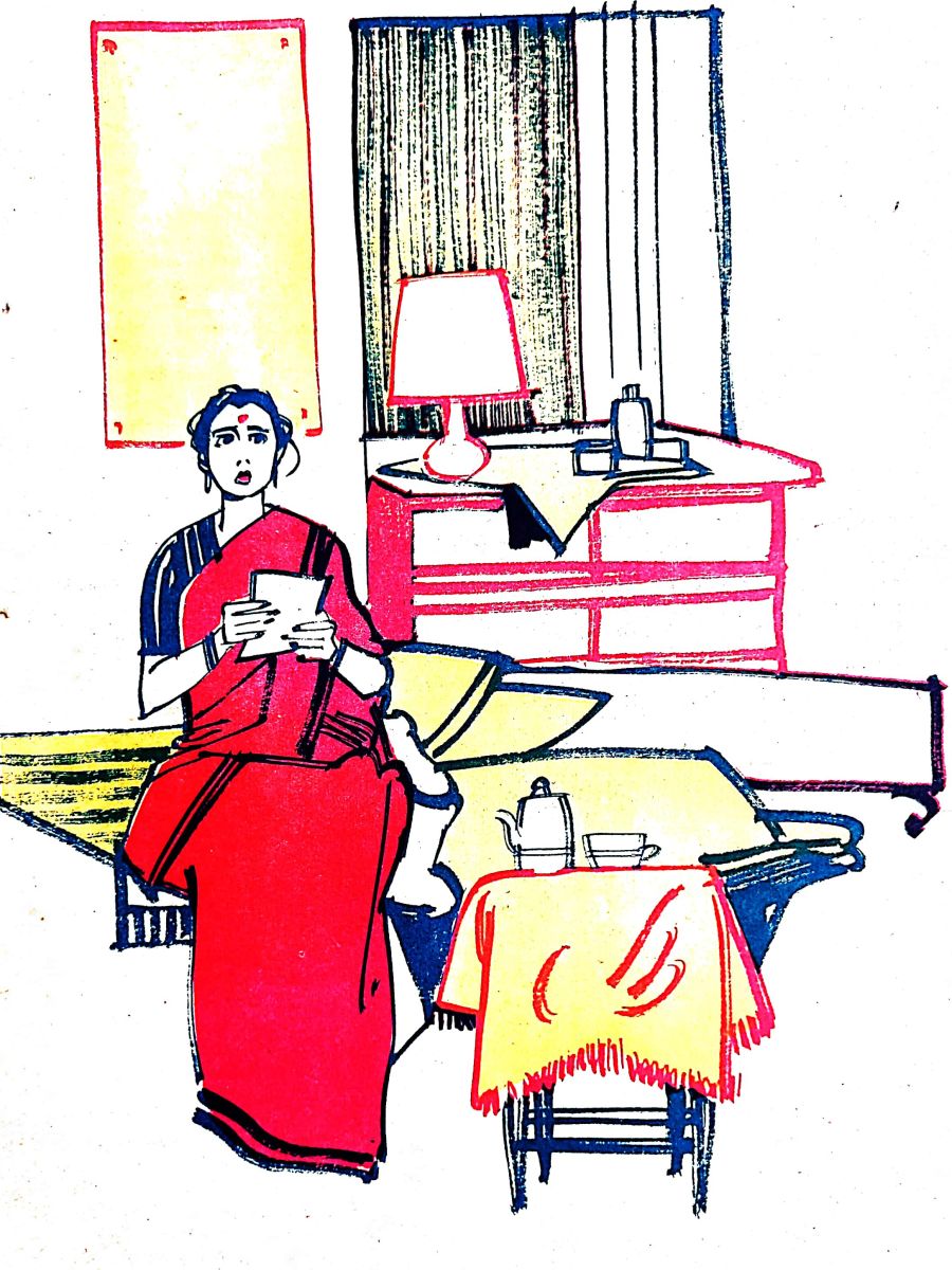గాభరాగా గదిలోకి చూసింది. అతని సూట్ కేసు ఉండవలసిన స్థలంలో లేదు. స్టాండు కు రాత్రి విడిచిన బట్టలు లేవు. ఆమెకు దుఃఖం ముంచుకువచ్చింది. గది, గదిలో వస్తువులు ఆమె కళ్ళ ముందు గుండ్రంగా తిరుగసాగేయి. అయోమయంగా చూస్తున్న ఆమెకు తలగడా కింద చిన్న కాగితం మడత కనిపించింది. అత్రతగా తీసి చదువుకొంది.