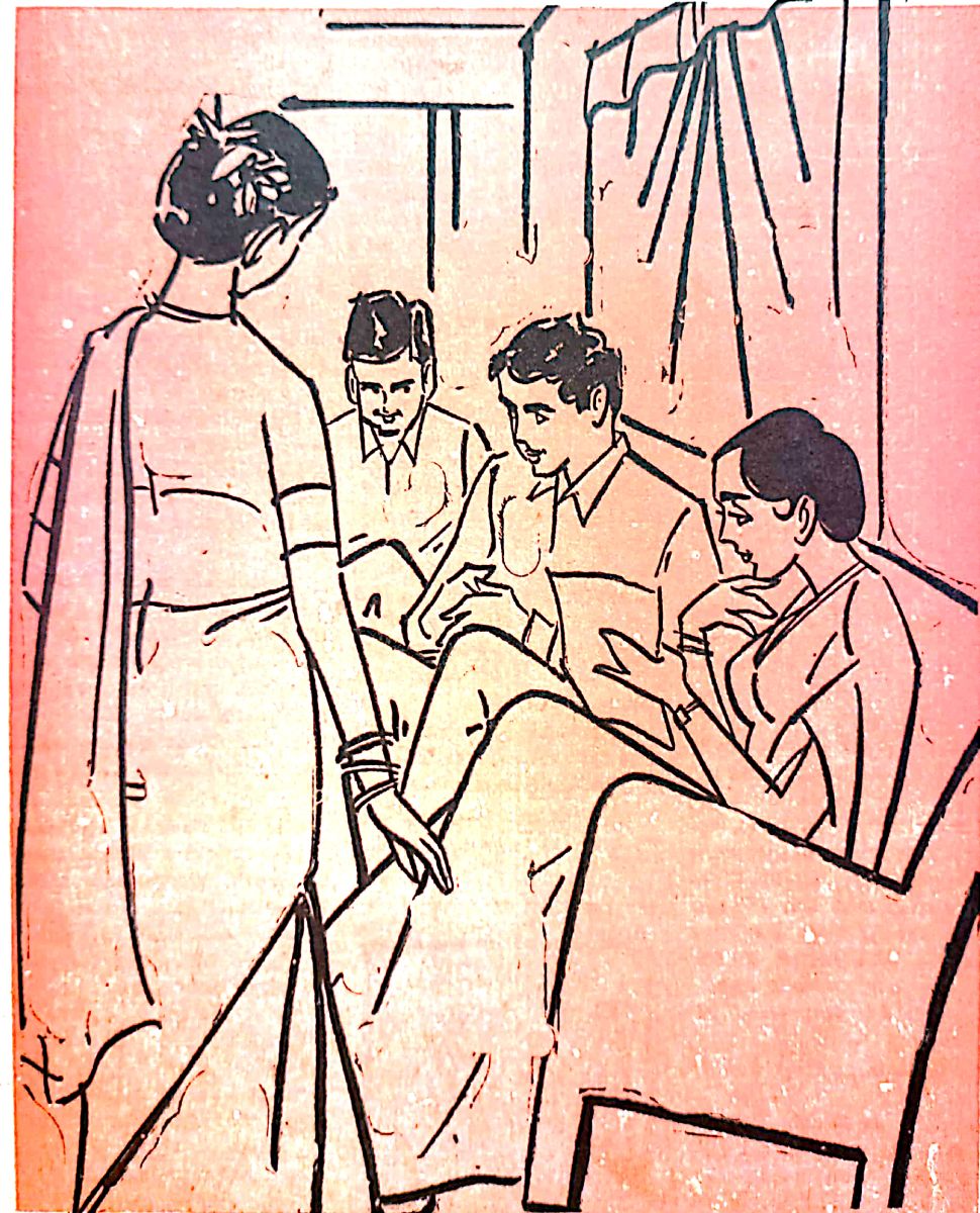 మూర్తి పెళ్ళికని అందరు బయలుదేరుతున్నారు యం. బి. బి. యస్ పరీక్షలై పోయాక అవేనని సెలవులో పెళ్ళి, అందరు చుట్టాలు స్టేషన్ కు వెళ్తున్నారు. ఆఖరి టాంగాలో ఆమె-కోడలు-మూర్తి కుమార్ ఎక్కడానికి ఏర్పాటైంది కాని ఆఖరి గడియలో మూర్తి తండ్రితో కలిసి వేరే టాంగాలో ఎక్కేసి వెళ్ళి పోయాడు.