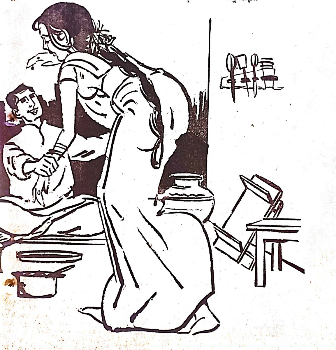 "ఈపూట శాస్త్రి గారి మనుమడి పుట్టిన రోజండీ" ఆమె చెప్పే మాటలు వినటము లేదు. ఆమె వంక దీక్షగా చూచాడు. వంగపండు రంగులో గల మదురై చీర కట్టింది. లేతగులాబీ రంగు జాకెట్టు , మెడలో పెద్ద బిళ్ళ గల నల్ల పూసల దండ. వింత అందము తో మెరిసిపోతున్నాయి. తలంటుకున్న జుట్టు పట్టులా, చెవుల పైకి జారినది. మరువము మల్లెల మాల సువాసనలు వెదజల్లుతూ అతన్ని మైమరిపించేశాయి. అతనిలో అణగారిన కోర్కెలు తలెత్తి బుసలు కొట్టసాగేయి. ఆమె వంగి ఏదో వడ్డించబోయినది. అతను ఆమె ముఖము రెండు చేతులలోకి తీసుకుని ఆవేశంగా చుంబించాడు.
