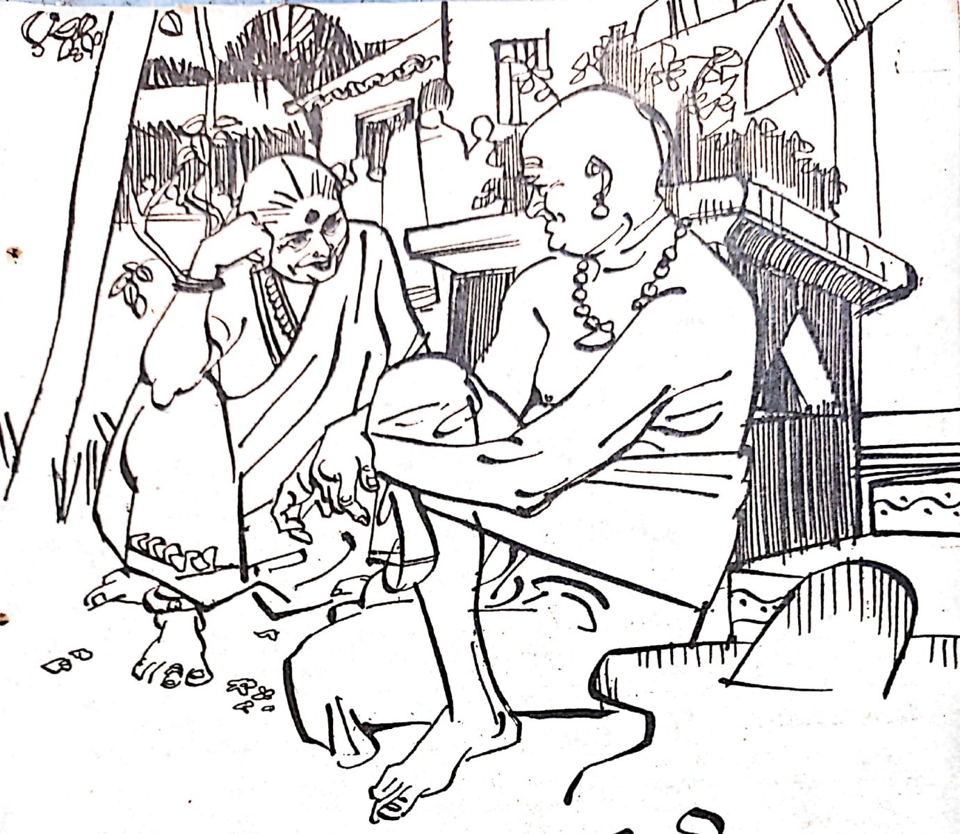 కృష్ణా జివం పరిచిన పీట, ఉద్దరిణి, పంచపాత్ర, ప్రక్కగా గంగ చెంబులో నీళ్ళు. విభూది తాటాకుపెట్టె, కుచ్చెళ్లు పెట్టి లుంగచుట్టిన గావంచా.