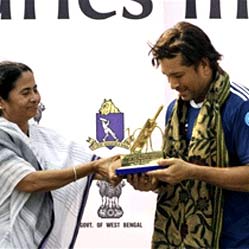 With the crowd roaring "Sachin, Sachin", and leaflets and cut-outs saluting him, batting maestro Sachin Tendulkar was Saturday felicitated by West Bengal Chief Minister Mamata Banerjee and the Cricket Association of Bengal (CAB) at the Eden Gardens for scoring a century of international hundreds.