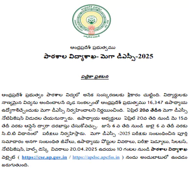 ఆంధ్రప్రదేశ్ ప్రభుత్వం నిరుద్యోగులకు శుభవార్త తెలిపింది. చాలా కాలంగా మెగా డీఎస్సీ కోసం కళ్లు కాయలు కాచేలా ఎదురు చూస్తున్న నిరుద్యోగుల ఎదురు చూపులకు ఫుల్ స్టాప్ పెట్టేసింది. మెగా డీఎస్సీ నోటిఫికేషన్ విడుదల తేదీని ప్రకటించేసింది. ఆంధ్రప్రదేశ్ విద్యాశాఖ శనివారం (ఏప్రిల్ 19) సాయంత్రం విడుదల చేసిన ప్రకటన మేరకు మెగా డిఎస్సీ 2025 నోటిఫికేషన్ఆదివారం (ఏప్రిల్ 20)న వెలువడ నుంది.