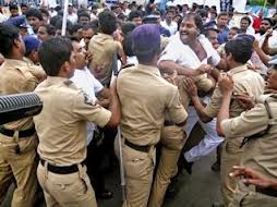 When all the top leaders of party enter the venue, some people who claim themselves to be ‘Chiranjeevi Fans’ have made protests for not putting any banner carrying Chiranjeevi’s picture in the venue. They demand to put the banners of their hero, but police disperse them in no time.