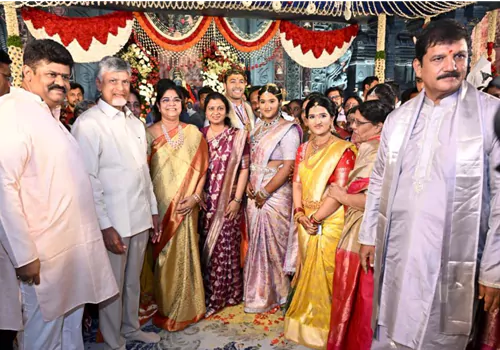 గుంటూరు జిల్లా టీడీపీ పొన్నూరు ఎమ్మెల్యే ధూళిపాళ్ల నరేంద్ర కుమార్తె వివాహ వేడుకలోకి తెలుగు రాష్ట్రాల ముఖ్యమంత్రులు చంద్రబాబు, రేవంత్రెడ్డి హాజరయ్యారు. గుంటూరులోని శ్రీకన్వెన్షన్లో నాగసాయి వైదీప్తి- కెవిన్ రామ్ పెళ్లి బుధవారం జరిగింది. విద్య, ఐటీ శాఖల మంత్రి నారా లోకేష్ పాల్గొన్నారు. ఈ వివాహ వేడుకకు తెలంగాణ సీఎం రేవంత్ రెడ్డి కుటుంబంతో పాటు హాజరయ్యారు.