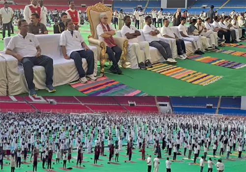 హైదరాబాద్ గచ్చిబౌలి స్టేడియంలో ఘనంగా అంతర్జాతీయ యోగా డే వేడుకలను ఆయుష, ఆరోగ్యశాఖ ఆథ్వర్యంలో ఘనంగా నిర్వహించాయి. ఈ కార్యక్రమానికి గవర్నర్ జిష్ణు దేవ్ వర్మ, ఆరోగ్యశాఖ మంత్రి దామోదర రాజనర్సింహ, స్పోర్ట్స్ మినిస్టర్ వాకిటి శ్రీహరి, స్పోర్ట్స్ అథారిటీ చైర్మన్ శివసేన రెడ్డి, సీఎస్ రామకృష్ణారావు ఇతర ప్రముఖులు, అధికారులు, విద్యార్థులు పాల్గొన్నారు. 5 వేల మంది విద్యార్థులు, యువకులు, పాల్గొని యోగాసలు వేశారు. ప్రపంచానికి భారతదేశం అందించిన గొప్ప వరం యోగా అని మంత్రి దామోదర రాజనర్సింహ అన్నారు. మహర్షి పతాంజలి అందించిన అష్టాంగ యోగా విద్యలే నేటి యోగాకు ప్రాణాధారమని చెప్పారు. యోగా కేవలం వ్యాయామానికి సంబంధించింది కాదని.. శరీరం, మనస్సు, ఆత్మను ఏకం చేసే అద్భుత సాధమన్నారు. ప్రస్తుతమున్న ఉరుకుల పరుగుల జీవన శైలితో బీపీ, షుగర్, క్యాన్సర్లు, కిడ్నీ సమస్యలు రోజు రోజుకూ పెరుగుతున్నాయన్నారు.