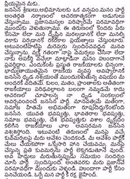 వ్యక్తిగతంగా నాపై విమర్శలు చేసినా.. నాకు అపకీర్తి వచ్చేలా మాట్లాడినా మనం హుందాగానే ప్రవర్తిదిద్దాం. ఎందుకంటే.. ప్రస్తుత రాజకీయాలకు భిన్నంగా, బాధ్యతాయుతమైన రాజకీయ వ్యవస్థ ఆవిష్కరానికి జనసేన దృఢ నిశ్చయంతో ముందుకెళుతున్న విషయం మీ అందరికీ విదితమే. కులం, మతం, ప్రాంతాలకు అతీతంగా రాజకీయాలు పరిఢవిల్లాలని బలంగా నమ్మడమే కాదు.. ఆచరణలో చూపాలన్న నా దృఢ సంకల్పంతో ఆవిర్భవించిందే జనసేన పార్టీ. మానవత్వమే మతంగా, సమాజ హితమే అభిమతంగా రూపుదిద్దుకుంటోంది జనసేన.