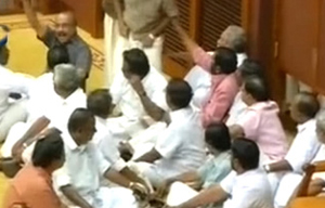 మనం అది రణరంగమేమోనని అపోహపడతాం కానీ, నిజానికి అది అసెంబ్లీ... బోలెడంతమంది విద్యాధికులు, తెలివైన వారు ఉన్నారని చెప్పుకునే కేరళ రాష్ట్ర అసెంబ్లీ. అసలేం జరిగిందంటే, కేరళ అసెంబ్లీలో శుక్రవారం నాడు ప్రతిపక్షాల ఆందోళనతో గందరగోళం నెలకొంది. అసెంబ్లీలోని అన్ని ద్వారాలనూ ప్రతిపక్ష సభ్యులు మూసివేశారు. మైక్లు, స్పీకర్ కుర్చీని ప్రతిపక్ష సభ్యులు విసిరేయడంతో ఉద్రిక్త పరిస్థితులు నెలకొన్నాయి. ప్రతిపక్షాల ఆందోళనల మధ్య రాష్ట్ర ఆర్థిక మంత్రి కె.ఎం.మణి బడ్జెట్ను శాసనసభలో ప్రవేశపెట్టారు. బార్ లైసెన్స్ల వ్యవహారంలో కేఎం మణి అవినీతికి పాల్పడ్డారన్న ఆరోపణలు ఉన్న నేపథ్యంలో ఆయన బడ్జెట్ని ప్రవేశపెట్టడానికి అనర్హుడని ప్రతిపక్షాలు పట్టుబట్టాయి. ప్రతిపక్షాల ఆందోళన నేపథ్యంలో కేఎం మణి రాత్రంతా అసెంబ్లీలోనే వున్నారు. ఈ నేపథ్యంలో కేరళ అసెంబ్లీ ఎదుట యుద్ధ వాతావరణం నెలకొంది. అధికార, ప్రతిపక్షాల మద్దతుదారులు అసెంబ్లీ వద్దకు భారీగా చేరుకున్నారు. వీరందరినీ చెదరగొట్టడానికి పోలీసులు నానా తంటాలు పడుతున్నారు.