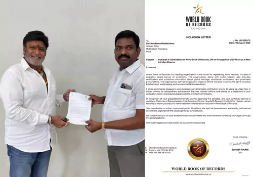 లండన్లో ప్రధాన కార్యాలయం ఉన్న వరల్డ్ బుక్ ఆఫ్ రికార్డ్స్, యూకే, యుఎస్ఎ, కెనడా, స్విట్జర్లాండ్, ఇండియా మరియు యుఎఇలలో ప్రపంచవ్యాప్తంగా గుర్తింపు పొందిన సంస్థ, వారి అత్యంత ప్రతిష్టాత్మకమైన గౌరవాలలో ఒకదాన్ని నట సింహం నందమూరి బాలకృష్ణ కి ప్రదానం చేస్తున్నారు - భారతీయ సినిమాలో అత్యంత ఘనమైన ఆయన వారసత్వం ఇప్పుడు డబ్ల్యూబీఆర్ గోల్డ్ ఎడిషన్లో నమోదు అవుతుంది.