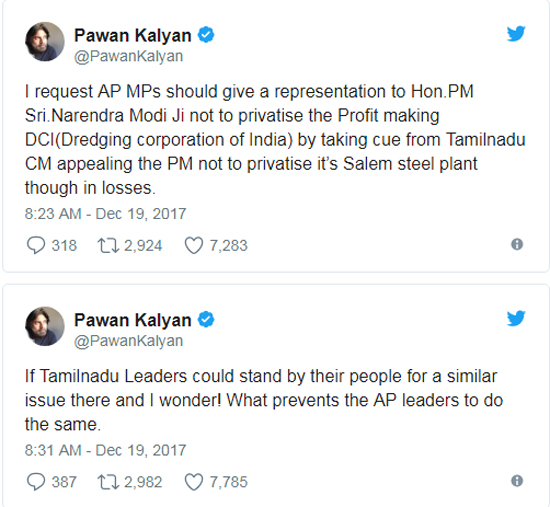 డీసీఐ (డ్రెడ్జింగ్ కార్పొరేషన్ ఆఫ్ ఇండియా) ప్రైవేటీకరణపై ఉద్యోగులు నిరసన వక్తం చేస్తున్నసంగతి తెలిసిందే కదా. ఈ ఉద్యోగులకు జనసేన అధినేత పవన్ కళ్యాణ్ మద్దతు కూడా ప్రకటించిన సంగతి విదితమే. అయితే ఇప్పుడు మరోసారి దీనిపై పవన్ ట్విట్టర్లో స్పందించాడు. ఆంధ్రప్రదేశ్ ఎంపీలంతా కలసి లాభాల్లో ఉన్న డీసీఐ ప్రైవేటీకరణ యత్నాలను అడ్డుకోవాలని.. దానికోసం ఢిల్లీకి వెళ్లి, ప్రధాని నరేంద్ర మోదీని కలిసి ఓ వినతిపత్రాన్ని ఇవ్వాలని సూచించారు. ఈ విషయంలో తమిళనాడును ఆదర్శంగా తీసుకోవాలని, నష్టాల్లో ఉన్నప్పటికీ, సేలం స్టీల్ ప్లాంటును ప్రైవేటు సంస్థలకు అప్పగించకుండా ఆ ప్రభుత్వం అడ్డుకుంటోందని గుర్తు చేశారు. తమిళనాడు రాష్ట్ర ప్రజల వెనుక అక్కడి నేతలు నిలబడగా లేనిది, మన రాష్ట్రంలో నేతలు మాత్రం అదే తరహా సమస్య పరిష్కారానికి ముందడుగు వేయకపోవడం తనకు ఆశ్చర్యాన్ని కలిగిస్తోందని అన్నారు. ఏపీ నేతలను ఎవరు ఆపుతున్నారో అర్థం కావడం లేదని తన ట్విట్టర్ ఖాతా ద్వారా విమర్శించారు.