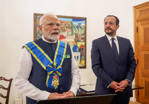 భారత ప్రధాని మోదీ ప్రస్తుతం సైప్రస్ దేశంలో పర్యటిస్తున్నారు. ఈ పర్యటనలో భాగంగా, సైప్రస్ అత్యున్నత పౌర పురస్కారమైన 'గ్రాండ్ క్రాస్ ఆఫ్ ది ఆర్డర్ ఆఫ్ మకారియోస్ 3'ను ప్రధాని మోదీ అందుకున్నారు. సైప్రస్ అధ్యక్షుడు నికోస్ క్రిస్టోడౌలిడెస్ ఈ ప్రతిష్ఠాత్మక అవార్డును మోదీకి అందజేశారు. ఈ గౌరవం 140 కోట్ల మంది భారతీయులకు దక్కిందని, ఇది ఇరు దేశాల మధ్య ఉన్న బలమైన సాంస్కృతిక సంబంధాలకు, సోదరభావానికి, వసుధైక కుటుంబం అనే భావనకు నిదర్శనమని ప్రధాని మోదీ ఈ సందర్భంగా వ్యాఖ్యానించారు.