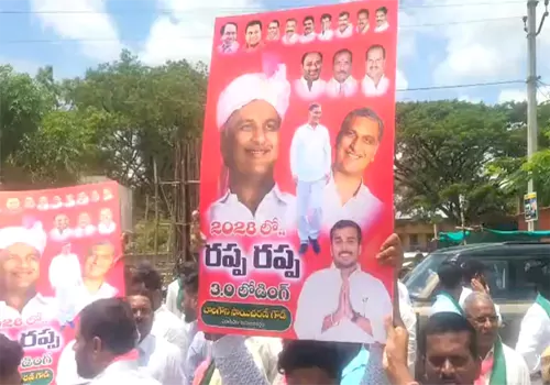 సంగారెడ్డి జిల్లా పటాన్చెరులో నిర్వహించిన రైతు ధర్నాలో బీఆర్ఎస్ కార్యకర్తలు పుష్ప మూవీ డైలాగ్ ప్లకార్డులు ప్రదర్శించారు. 2028 లో రప్పా రప్పా 3.0 లోడింగ్" అంటూ మాజీ మంత్రి హారీశ్రావు, ఫోటోలతో ప్లకార్డులు రూపోందించారు. కాగా మాజీ సీఎం జగన్ సత్తెనపల్లి పర్యాటనలోనూ ఓ యువకుడు ఇదే డైలాగ్తో ప్లకార్డులు ప్రదర్శించిగా పోలీసులు అరెస్ట్ చేసిన విషయం తెలిసిందే. తెలుగు రాష్ట్రాల రాజకీయల్లో పుష్ప డైలాగ్ కాక రేపుతోంది.