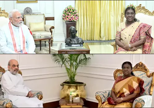 భారత రాష్ట్రపతి ద్రౌపదీ ముర్ముతో ప్రధాన మంత్రి నరేంద్ర మోదీ, కేంద్ర హోంమంత్రి అమిత్ షా ఒకే రోజున గంటల వ్యవధిలో భేటీ కావడం ఇప్పుడు దేశ రాజకీయాల్లో చర్చనీయాంశంగా మారింది. వీరి వరుస భేటీల వెనక కారణాలు తెలియనప్పటికీ గంటల వ్యవధిలోనే ఇరువురు కీలక నేతలు రాష్ట్రపతితో సమావేశం కావడం అత్యంత ప్రాధాన్యం సంతరించుకుంది. నిజానికి.. ప్రధాని నరేంద్ర మోదీ వరసగా రెండు రోజులు అంటే శని, ఆది(ఆగష్టు 2, 3) వారాలలో రాష్ట్రపతితో భేటీ అయ్యారు.