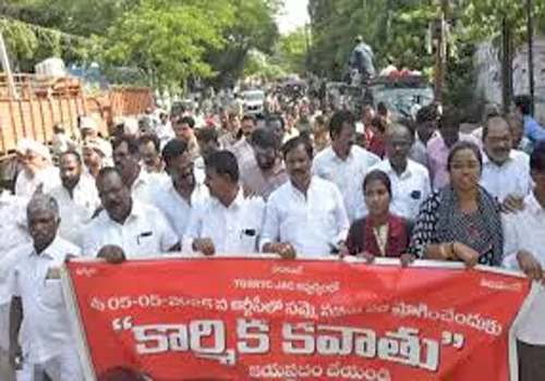 తెలంగాణ రాష్ట్ర రోడ్డు రవాణా సంస్థ టీజీఆర్టీసీ కార్మిక సంఘాల ఐక్య కార్యాచరణ సమితి జేఏసీ సమ్మెకు సిద్ధమవుతోంది. ఈనెల 7 నుంచి సమ్మె నేపధ్యంలో భారీ ఎత్తున కార్మికులతో ర్యాలీ నిర్వహించారు. హైదరాబాద్లో బాగ్ లింగంపల్లిలోని ఆర్టీసీ కళాభవన్ నుంచి బస్ భవన్ వరకు ర్యాలీ కొనసాగింది. తమ సమస్యల పరిష్కారం కోసం పలుమార్లు ప్రభుత్వానికి, యాజమాన్యానికి విజ్ఞప్తి చేసినా ఫలితం లేకపోయిందని ఆర్టీసీ కార్మిక సంఘాల జేఏసీ ఛైర్మన్ వెంకన్న వాపోయారు.