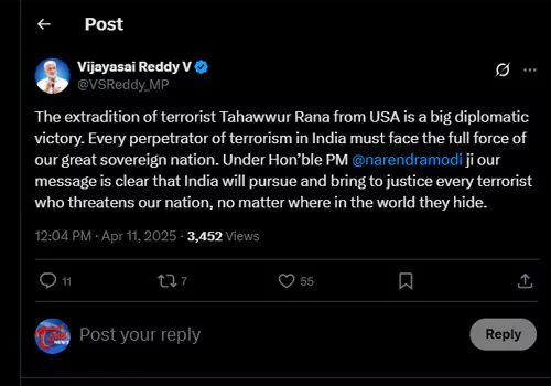 ఆ పోస్టులో విజయ సాయి ముంబైపేలుళ్ల సూత్రధారి తహవ్వుర్ రాణా ను భారత్ కు రప్పించడం మోడీ దౌత్య విజయంగా అభివర్ణించారు. మోడీ నేతృత్వంలో దేశ భద్రతకు ముప్పు తలపెట్టిన ఏ ఉగ్రవాదినీ భారత్ వదిలిపెట్టబోదన్న సందేశాన్ని ప్రధాని మోడీ ప్రపంచానికి చాటారని విజయసాయి ఆ పోస్టులో పేర్కొన్నారు. దీంతో విజయసాయి బీజేపీ గూటికి చేరి, రాజ్యసభలో అడుగుపెట్టడానికి ఇంకెంతో సమయం పట్టదని పరిశీలకులు భావిస్తున్నారు.
