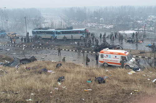 జమ్ముకశ్మీర్‌లో ఉగ్రవాదులు ఘాతుకానికి ఒడిగట్టారు. అవంతిపుర సమీపంలో సీఆర్పీఎఫ్‌ జవాన్లు ప్రయాణిస్తున్న బస్సుని పేలుడు పదార్థాలతో నిండిన కారు ఢీకొట్టడంతో భారీ పేలుడు సంభవించింది. ఈ దాడి నుండి జవాన్లను కోలుకోనివ్వకుండా పేలుడు  జరిగిన వెంటనే ఉగ్రవాదులు కాల్పులకు కూడా తెగబడ్డారు. దీంతో భారీగా ప్రాణనష్టం జరిగింది. ఈ ప్రమాదంలో 18 మంది సీఆర్పీఎఫ్‌ జవాన్లు ప్రాణాలు కోల్పోగా.. పలువురు తీవ్రంగా గాయపడ్డారు. సీఆర్పీఎఫ్‌ కాన్వాయ్‌ వెళ్తుండగా ఉగ్రవాదులు ఈ దాడికి తెగబడ్డారు. కాన్వాయ్‌లో మొత్తం 70 వాహనాలు ఉన్నాయి. ఓ బస్సు దగ్గరకు రాగానే ఉగ్రవాది కారుతో ఢీకొట్టాడు. ఈ పేలుడు ధాటికి చుట్టుపక్కల ఉన్న దాదాపు 40 మంది తీవ్రంగా గాయపడ్డారు. మృతుల సంఖ్య మరింత పెరిగే అవకాశం ఉంది. పేలుడు వల్ల ఆ ప్రాంతమంతా తెగిపడిన శరీర అవయవాలతో రక్తమోడింది. ఘటనా స్థలానికి చేరుకున్న భద్రతా సిబ్బంది క్షతగాత్రులను ఆస్పత్రికి తరలించారు. సీఆర్పీఎఫ్‌ కాన్వాయ్‌పై తామే దాడి చేసినట్లు జైషే ఈ మహ్మద్‌ ఉగ్ర సంస్థ ప్రకటించుకుంది. కారు నడిపిన ఉగ్రవాదిని పుల్వామా ప్రాంతానికి చెందిన అదిల్‌ అహ్మద్‌గా పోలీసులు గుర్తించారు. ఇది ఈ 15 ఏళ్లలో జరిగిన అతిపెద్ద దాడిగా మిలటరీ వర్గాలు చెబుతున్నాయి.
