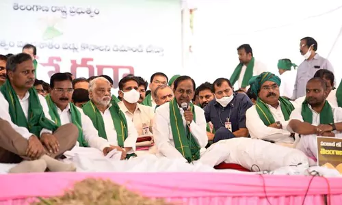 రైతులకు వ్యతిరేకంగా కేంద్రం తీసుకుంటున్న నిర్ణయాలపై తెలంగాణ ముఖ్యమంత్రి కేసీఆర్ తీవ్ర స్థాయిలో ధ్వజమెత్తారు. ఒకటే మాట.. ఏం జరుగుతోంది. ఏంది గడబిడి ఇది. లొల్లి ఏంది అసలు. ఒకటే ఒక మాట. సాఫ్ సీదా ముచ్చట. తెలంగాణలో పండించే వడ్లు కొంటరా..? కొనరా..? అది చెప్పమంటే.. మేం మరాఠీలో అడిగామా? ఉర్దూలో అడిగామా? అర్థం కాని భాషలో అడిగామా? అని కేసీఆర్ ప్రశ్నించారు. ఇందిరా పార్క్ వద్ద టీఆర్ఎస్ చేపట్టిన రైతు మహాధర్నాలో కేసీఆర్ ప్రసంగించారు. బీజేపీ నాయకులు వంకర టింకర మాటలు మాట్లాడుతున్నారు. ఈ గోస ఒక తెలంగాణలోనే లేదు. భారతదేశం మొత్తంలో ఉంది. ఒక ఏడాది కాలం నుంచి ఢిల్లీ సరిహద్దుల్లో వేల లక్షల మంది రైతులు వరుస నిరాహార ధీక్షలు చేస్తున్నారు. పంటలు పండించే శక్తి లేక కాదు. కేంద్రం తెచ్చిన చట్టాలకు వ్యతిరేకంగా రైతులు నిరసన వ్యక్తం చేస్తున్నారు. మద్దతు ధర ఇవ్వాలని డిమాండ్ చేస్తున్నారు. కేంద్రం తన విధానాలు మార్చుకోకుండా అడ్డగోలుగా మాట్లాడుతోంది. ఈ దేశాన్ని నడపడంలో అన్ని పార్టీల ప్రభుత్వాలు దారుణంగా విఫలం చెందాయి. పంటలు కొనడానికి మీకు భయం అవుతుంది. బాధ అవుతుంది. అడ్డగోలుగా మాట్లాడటం కాదు.. గ్లోబల్ హంగర్ ఇండెక్స్లో భారత్ 101వ స్థానంలో ఉంది. ఇంతకన్న సిగ్గుచేటు ఏమైనా ఉంటదా? దేశంలో 12 కోట్ల మంది రైతుల ఉన్నారు. 40 కోట్ల ఎకరాల వ్యవసాయ భూమి ఉంది. అద్భుతమైన నదులున్నాయి. బంగారు పంటలు పండే అవకాశాలు ఉన్నాయి. దాదాపు సగం మంది వ్యవసాయ రంగంపై ఆధారపడి బతుకుతున్నారు అని సీఎం కేసీఆర్ తెలిపారు. మేం రాష్ట్రం తెచ్చుకుని, చెరువులను బాగు చేసుకుని, చెక్డ్యాంలు కట్టి, కరెంట్ ఇచ్చి రైతులను బాగు చేసుకున్నాం. పంటలు పండించుకున్నాం. ఆ ధాన్యాన్ని కొనుగోలు చేసే బాధ్యత కేంద్రానిదే. కానీ నిర్లక్ష్యం వహిస్తోంది. రైతాంగాన్ని కాపాడాల్సిన అవసరం ఉంది. హంగర్ ఇండెక్స్లో భారత్ ఆకలి రాజ్యం అని తెలుస్తోంది. దేశంలో ఏ మూలలో ఆహార కొరత ఉందో సమన్వయం చేయాలి. అవసరమైతే డబ్బులు ఖర్చు పెట్టి ఆహారం అందించాలి. సమస్య ఉన్నదంతా కేంద్రం వద్దే. కేంద్రం మీద యుద్ధం ప్రారంభమైంది. ఉత్తర భారత రైతాంగం కేంద్రానికి నిరసన వ్యక్తం చేస్తోంది. రైతుల జీవితాలపై చెలగాటమాడుతోంది. కార్లతో తొక్కి చంపుతోంది. ఇవాళ తెలంగాణ రైతులపై బీజేపీ నేతలు కన్నేశారు. కొనుగోలు కేంద్రాల వద్ద విధ్వంసం సృష్టిస్తున్నారు. రైతులను బతకనిస్తారా? బతకనివ్వారా? అని కేసీఆర్ ప్రశ్నించారు. దిక్కు మాలిన కేంద్ర ప్రభుత్వం విధానాల వల్లే రైతులు నష్టపోతున్నారు. వడ్లు వేయాలి.. మెడలు వంచి కొనిపిస్తాం అని బీజేపీ నేతలు అంటున్నారు. ఈ దేశాన్ని పాలించే బీజేపీ అడ్డగోలు అబద్ధాలు మాట్లాడుతున్నారు. ఫేస్ బుక్, వాట్సాప్లలో వితండవాదాలు సృష్టిస్తున్నారు అని సీఎ