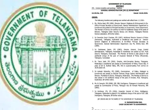తెలంగాణ ప్రభుత్వం పరిపాలనా రంగంలో కీలక నిర్ణయాలు తీసుకుంది. రాష్ట్రంలో ఏడుగురు ఐపీఎస్ అధికారులను బదిలీ చేస్తూ కొత్త నియామకాలకు ఆమోదం తెలిపింది. సాధారణ పరిపాలన విభాగం విడుదల చేసిన ఉత్తర్వుల ప్రకారం, ఈ మార్పులు మే 1, 2026 నుంచి అమల్లోకి రానున్నాయి. హోం శాఖ ప్రధాన కార్యదర్శిగా శిఖా గోయల్ ప్రస్తుతం విజిలెన్స్ & ఎన్ఫోర్స్మెంట్ డీజీగా పనిచేస్తున్న శిఖా గోయల్ను హోం శాఖ ప్రధాన కార్యదర్శిగా నియమించారు. తదుపరి ఉత్తర్వులు వెలువడే వరకు తెలంగాణ సైబర్ సెక్యూరిటీ బ్యూరో డైరెక్టర్, ఫోరెన్సిక్ సైన్స్ ల్యాబొరేటరీ డైరెక్టర్ బాధ్యతలను కూడా ఆమె అదనంగా నిర్వహించనున్నారు. విజిలెన్స్ డీజీగా దేవేంద్ర సింగ్ చౌహాన్ అడిషనల్ డీజీపీ (పర్సనల్)గా ఉన్న దేవేంద్ర సింగ్ చౌహాన్ను విజిలెన్స్ & ఎన్ఫోర్స్మెంట్ డైరెక్టర్ జనరల్గా నియమించారు. ఈ పదవికి సంబంధించిన ఎక్స్-అఫీషియో ప్రిన్సిపల్ సెక్రటరీ బాధ్యతలను కూడా ఆయన నిర్వహించనున్నారు. మల్టీజోన్–2 ఐజీపీగా షానవాజ్ ఖాసిం డ్రగ్స్ కంట్రోల్ అడ్మినిస్ట్రేషన్ డీజీగా ఉన్న షానవాజ్ ఖాసిం ను మల్టీజోన్–2 ఐజీపీగా బదిలీ చేశారు. ఐజీపీ (పర్సనల్)గా అదనపు బాధ్యతలను కూడా ఆయనకు అప్పగించారు. ఫ్యూచర్ సిటీ సీపీగా డాక్టర్ తరుణ్ జోషి యాంటీ కరప్షన్ బ్యూరో డైరెక్టర్గా ఉన్న డాక్టర్ తరుణ్ జోషిని ఫ్యూచర్ సిటీ పోలీస్ కమిషనర్గా నియమించారు. ప్రస్తుత సీపీ జి. సుధీర్ బాబు ఏప్రిల్ 30న పదవీ విరమణ చేయనున్న నేపథ్యంలో ఈ నియామకం జరిగింది. డ్రగ్స్ కంట్రోల్ డీజీగా అవినాష్ మొహంతి సైబరాబాద్ (మల్కాజిగిరి) పోలీస్ కమిషనర్గా ఉన్న అవినాష్ మొహంతిని డ్రగ్స్ కంట్రోల్ అడ్మినిస్ట్రేషన్ డీజీగా బదిలీ చేశారు. ప్రొహిబిషన్ & ఎక్సైజ్ డైరెక్టర్ బాధ్యతలతో పాటు ఏసీబీ డైరెక్టర్గా అదనపు బాధ్యతలను కూడా ఆయన చేపట్టనున్నారు. మల్కాజిగిరి సీపీగా బి. సుమతి ఇంటెలిజెన్స్ విభాగం ఐజీపీగా ఉన్న బి. సుమతిని మల్కాజిగిరి పోలీస్ కమిషనర్గా నియమించారు. కార్తికేయకు అదనపు బాధ్యతలు ఇంటెలిజెన్స్ ఐజీపీగా ఉన్న కార్తికేయకు ఎస్ఐబీ (ఇంటెలిజెన్స్) ఐజీపీగా అదనపు బాధ్యతలు అప్పగించారు. ఈ బదిలీలతో రాష్ట్ర పోలీసు వ్యవస్థలో కీలక విభాగాలకు కొత్త నాయకత్వం లభించనుంది. పరిపాలన మరింత సమర్థవంతంగా కొనసాగేందుకు ఈ మార్పులు దోహదపడతాయని అధికార వర్గాలు భావిస్తున్నాయి.