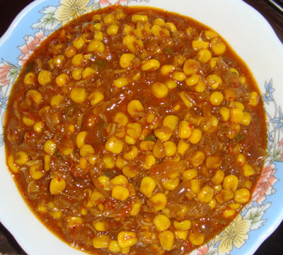 Add the tomatoes and saute till oil separates. Add corn and mix. Place lid and cook for 4 mts. Add half of the coriander leaves and 11/2 cups water and bring to a boil.
