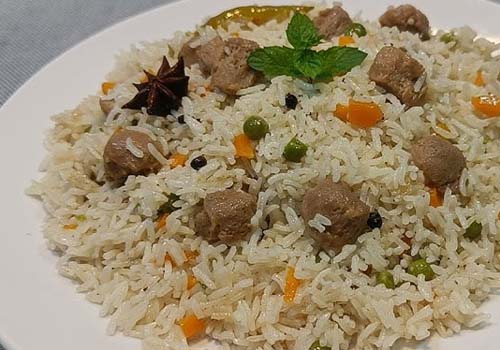 ఆ తర్వాత ఉడికించి పెట్టుకున్న పచ్చి బఠాణీ , ఆలు ముక్కలు, మీల్ మేకర్ వేసి వేయించి సరిపడా నీళ్ళుపోసి ఉప్పు వేసి కడిగిన బియ్యం వేసి 2 విజిల్స్ వచ్చే వరకు ఉంచాలి.