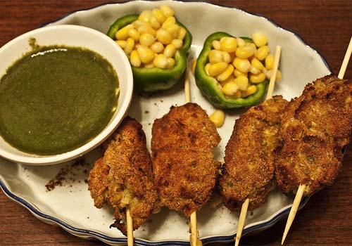 First grind boiled sweet corn coarsely in a blender leaving few kennels as a whole. Mash the boiled potatoes and mix all the ingredients. Keep this mixture for 10 minutes in the refrigerator. Now take it out and make shape of kababs around ice cream stick. Deep dry this in oil till they turn golden brown colour from all sides. Enjoy it with mint chutney.