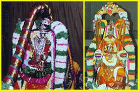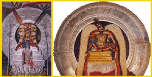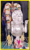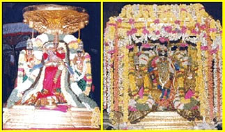A chariot decorated heavily with pearls is prepared for the procession on the third day's night. Lord with his consorts shine in the purity and royalty of the pearls.