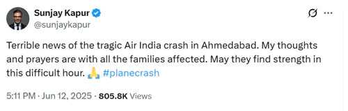 నిన్న అహ్మదాబాద్ విమానం కూలిన ఘటనలో 200 మందికి పైగా ప్రాణాలు కోల్పోయిన సంగతి తెలిసిందే. ఈ ఘటనపై విచారం వ్యక్తం చేస్తూ.. సంజయ్ ట్వీట్ చేశారు. ఆ ట్వీట్ చేసిన కొద్ది గంటలకే ఆయన గుండెపోటుతో కన్నుమూశారు. సంజయ్ కపూర్ మరణం పట్ల బాలీవుడ్ ప్రముఖలు, నెటిజెన్లు సంతాపం తెలుపుతున్నారు.