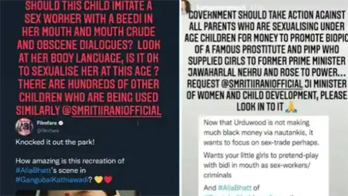 1960లలో ముంబైలోని రెడ్ లైట్ ఏరియాకు చెందిన ఓ వేశ్య జీవిత కథ ఆధారంగా తెరకెక్కిన సినిమా 'గంగూబాయ్ కథియవాడి'. ఆలియా భట్ టైటిల్ రోల్ పోషించిన ఈ సినిమా ఫిబ్రవరి 25 న ప్రేక్షకుల ముందుకు రానుంది. ఈ సినిమాలో వేశ్య పాత్రలో ఆలియా చెప్పిన డైలాగ్స్ కు ఇన్స్టాగ్రామ్లో పలువురు చిన్నారులు రీల్స్ చేస్తున్నారు. అయితే దీనిపై స్పందించిన కంగనా నెహ్రూపై దారుణ వ్యాఖ్యలు చేసింది.