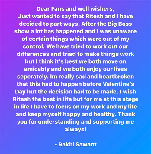 "రితేష్, నేను విడిపోయి మా దారులు మేం చూసుకోవాలి అనుకుంటున్నాం. బిగ్ బాస్ తర్వాత మా మధ్య తలెత్తిన విభేదాలు చేజరిపోయాయి. విభేదాలు తొలగించుకునేందుకు ఎంతో ప్రయత్నించాం. కానీ సాధ్యం కాలేదు. అందుకే విడిపోవాలని నిర్ణయం తీసుకున్నాం. వాలెంటైన్స్ డే సమయంలో ఇలా జరగడం బాధగా ఉంది. రితేష్ కి తన జీవితంలో మంచి జరగాలని కోరుకుంటున్నా. ఇకపై నా దృష్టంతా నా లైఫ్, నా కెరీర్ పై పెట్టి హ్యాపీగా జీవించాలి అనుకుంటున్నాను" అని రాఖీ సావంత్ తెలిపింది. ఈ మేరకు ఆమె ఒక నోట్ విడుదల చేసింది.