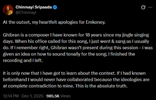 Chinmayi, who performed the song, issued a public apology shortly after its release, stating that she had been unaware of the film’s ideological background at the time of recording. She added that had she known more about the project, she would have declined to participate.
