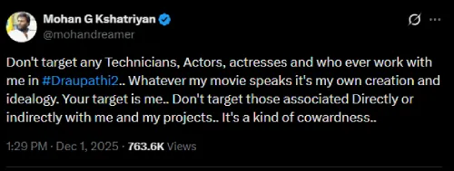 Mohan G also urged the public not to target other members of the film’s cast and crew, stressing that criticism should be directed at him alone. Targeting collaborators, he said, amounted to “cowardice.”