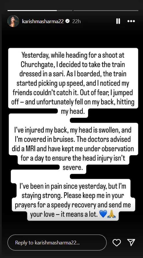 రన్నింగ్ ట్రైన్ నుండి దూకడంతో గాయాలతో ఆసుపత్రి పాలైనట్లు తాజాగా కరిష్మా శర్మ తన ఇన్ స్టాగ్రామ్ హ్యాండిల్ లో పోస్ట్ పెట్టింది. "చర్చిగేట్ లో జరగనున్న షూటింగ్ కి వెళ్లడం కోసం ట్రైన్ ఎక్కాను. కానీ, నా ఫ్రెండ్స్ ఆ ట్రైన్ అందుకోలేకపోయారు. దీంతో భయంతో కదులుతున్న రైలు నుంచి దూకేశాను. నా వీపుకి, తలకు గాయాలయ్యాయి. వైద్య పరీక్షల అనంతరం.. డాక్టర్ల సూచన మేరకు విశ్రాంతి తీసుకుంటున్నాను. పెయిన్ ఉన్నప్పటికీ, నేను స్ట్రాంగ్ గానే ఉన్నాను. నేను త్వరగా కోలుకోవాలని ప్రార్థించండి. మీ ప్రేమే నాకు బలం." అని కరిష్మా శర్మ రాసుకొచ్చింది.