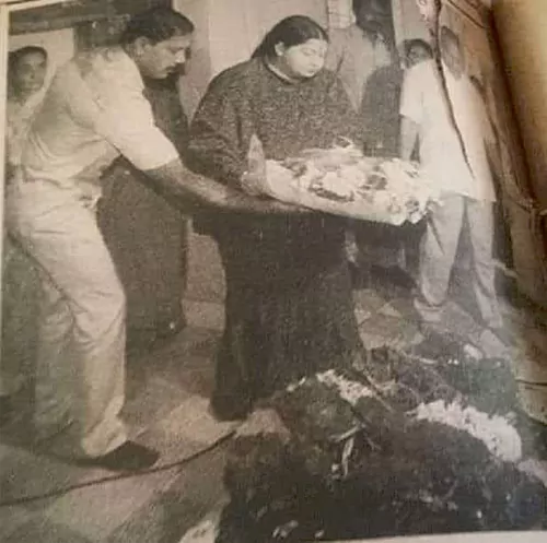 కాసేపటికి కారు ఒక ఇంటి ముందు ఆగింది. అప్పటికే కొంతమంది అక్కడ వున్నారు. జయలలిత కారు దిగి ఇంట్లోకి వెళ్ళారు. ఎదురుగా శవపేటిక ఉంది. చేతులు జోడించి శవపేటిక చుట్టూ మూడు సార్లు తిరిగారు. సెక్రటరీ అందించిన పుష్పగుచ్ఛాన్ని అక్కడ ఉంచి, నమస్కారం చేశారు. ఆమె కంటి నుంచి కారుతున్న కన్నీటిని తుడుచుకున్నారు. జయలలితను అలా చూసి సెక్రటరీ నివ్వెరపోయాడు. ఆమె జీవితం లో ఎన్నో కష్టాలను, ఘోర అవమానాలను చూశారు. ఎన్ని ఎదురైనా శిఖరంలా నిలబడ్డారు కానీ ఎప్పుడు కన్నీరు పెట్టింది లేదు. అలాంటిది ఆమె మొదటిసారి కంటతడి పెట్టుకున్నారు.