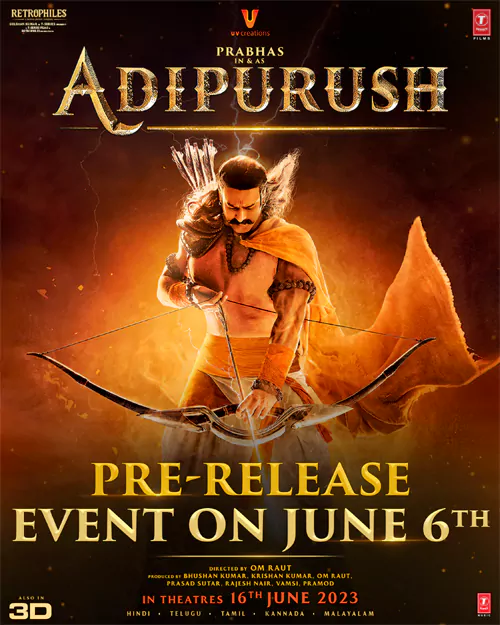 రెబల్ స్టార్ ప్రభాస్ శ్రీరాముడి పాత్రలో కనువిందు చేయనున్న చిత్రం 'ఆదిపురుష్'. టి.సిరీస్ అత్యంత భారీ బడ్జెట్ తో నిర్మిస్తున్న ఈ చిత్రానికి ఓం రౌత్ దర్శకుడు. ఇందులో సీతగా కృతి సనన్, రావణుడిగా సైఫ్ అలీ ఖాన్ నటిస్తున్నారు. ఈ చిత్రం జూన్ 16న ప్రేక్షకుల ముందుకు రానుంది. తెలుగులో ఈ చిత్రాన్ని యూవీ క్రియేషన్స్ విడుదల చేయనుంది. ఇటీవల ఈ సినిమా నుంచి విడుదలైన ట్రైలర్ కి, జై శ్రీరామ్ పాటకి విశేష స్పందన లభించింది. ఇక ఇప్పుడు ఈ మూవీ ప్రీరిలీజ్ ఈవెంట్ కి ముహూర్తం ఖరారైంది.